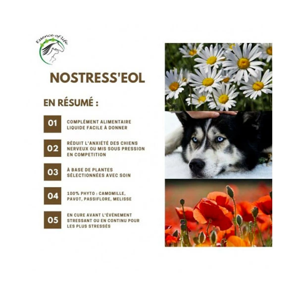 Nostress’EOL de la marque ESSENCE OF LIFE est un complément alimentaire de soutien pour les animaux stressés.