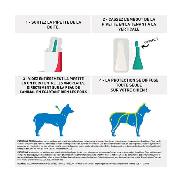 FRONTLINEÂź COMBO est actif sur les puces adultes, leurs oeufs et leurs larves, permettant une action combinĂ©e sur l’animal et son environnement.