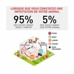 - Inhibe le dĂ©veloppement des oeufs, larves et pupes des puces pendant 8 semaines chez le chien ce qui permet d’Ă©viter la contamination de l’environnement du chien pendant cette mĂȘme durĂ©e.