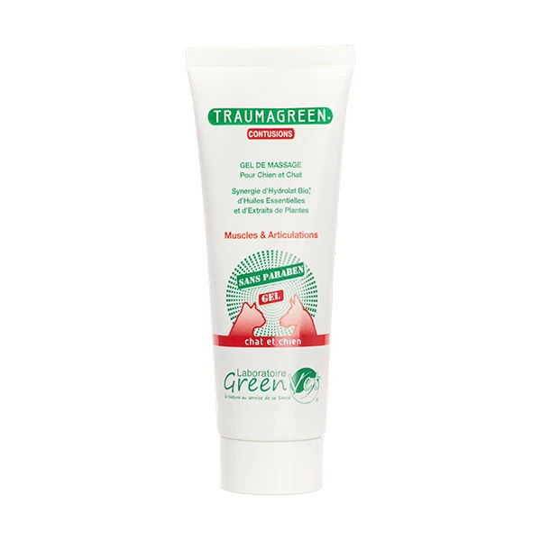 Greenvet Traumagreen, gel de massage pour chiens et chats à appliquer en cas de contusions. Il soulage les zones articulaires et/ou musculaires.