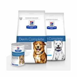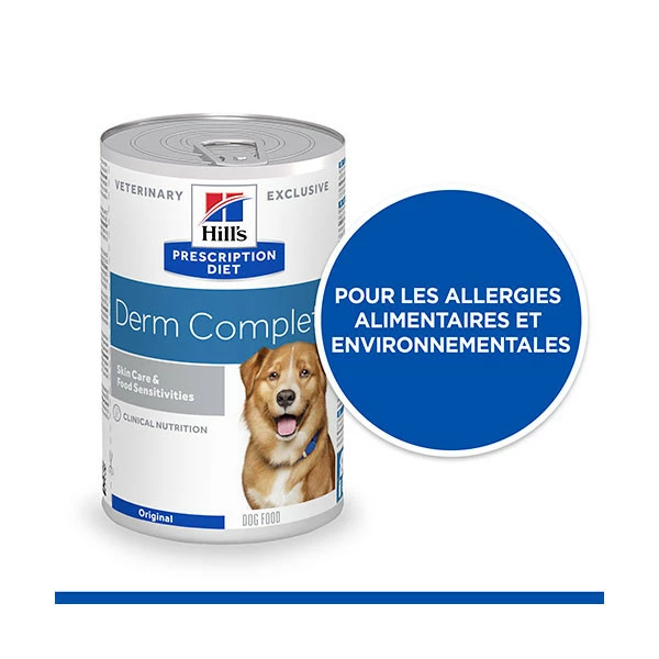 Hill’s Prescription Diet Derm Complete pĂątĂ©e an boĂźte pour chien est la seule alimentation pour les sensibilitĂ©s alimentaires et environnementales. Elle aide Ă gĂ©rer les allergies, la peau sĂšche, les dĂ©mangeaisons et le phĂ©nomĂšne de grattage chez le chien.