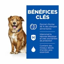 Principales indications : AmĂ©liore la santĂ© de la peau en cas d’infections secondaires ou d’autres dermatoses ; dermatite atopique (allergies environnementales) ; rĂ©actions indĂ©sirables aux aliments exceptĂ© allergie connue Ă l’Ćuf ; dermatite allergique aux puces ; dermatite prurigineuse ; entĂ©ropathie rĂ©pondant Ă l’alimentation.