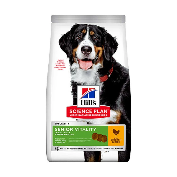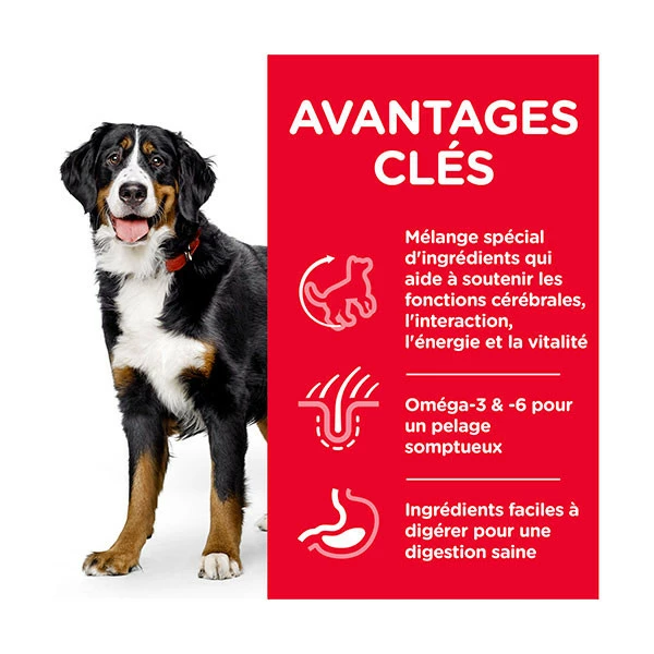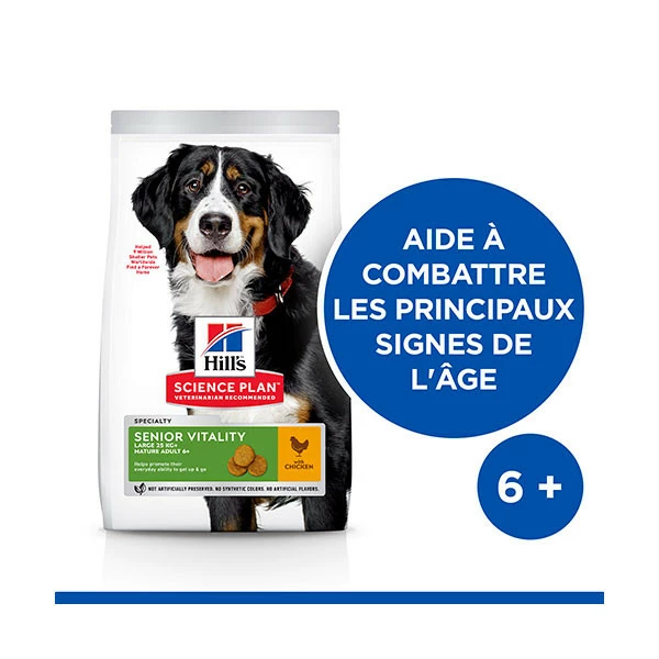 Ce n’est pas parce que votre chien prend de l’âge qu’il doit s’arreter de jouer. Les croquettes pour chien âgĂ© de grande race HILL’S SCIENCE PLAN Senior Vitality au poulet l’aident Ă rester actif au quotidien.