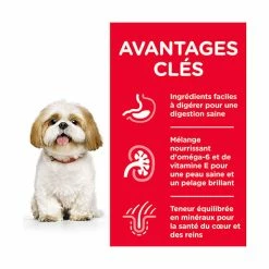Si les petits chiens ont des besoins propres en matiĂšre de nutrition, les petits chiens ĂągĂ©s ont des exigences encore plus spĂ©cifiques. HILL’S SCIENCE PLAN Mature Adult Small & Mini 7+ aide les petits chiens ĂągĂ©s de 7 ans et plus Ă bien vieillir. Il contient un mĂ©lange synergique de nutriments pour favoriser la vigueur et lâĂ©nergie de votre animal.