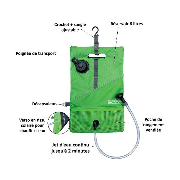 Le verso est en tissu noir solaire permettant de rĂ©chauffer lâeau au soleil. La douche se range facilement : le rĂ©servoir se roule sur lui-mĂȘme et le cordon et pommeau de douche peuvent ĂȘtre retirĂ©s ; ce qui permet Ă©galement de laver le rĂ©servoir en machine.