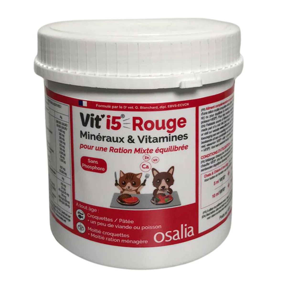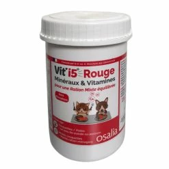 Vit’i5 ROUGE apporte minĂ©raux, vitamines et oligo-Ă©lĂ©ments. C’est un complĂ©ment indispensable pour Ă©quilibrer la l’alimentation des chiens et chats nourrit par rations mixtes de type :