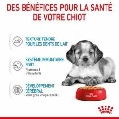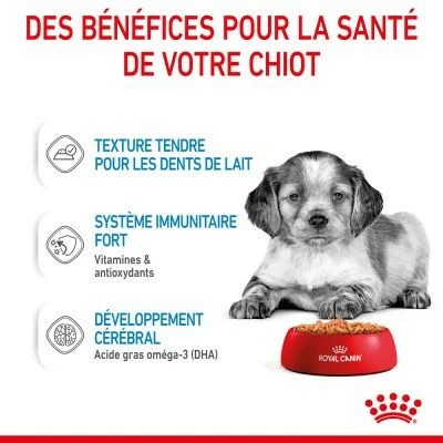 Pour le dĂ©veloppement du cerveau et des yeux, l’aliment Royal Canin Medium Puppy contient des acides gras en omĂ©ga–3 comme des DHA. Pour la digestion de votre chien, il possĂšde Ă©galement des prĂ©biotiques, protĂ©ines digestes pour l’Ă©quilibre de la flore intestinale.