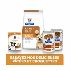 - Cliniquement prouvé : k/d Canine permet de ralentir l’évolution de la maladie lorsqu’il est donné au stade précoce des maladies rénales.