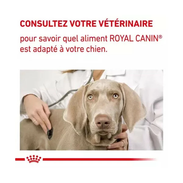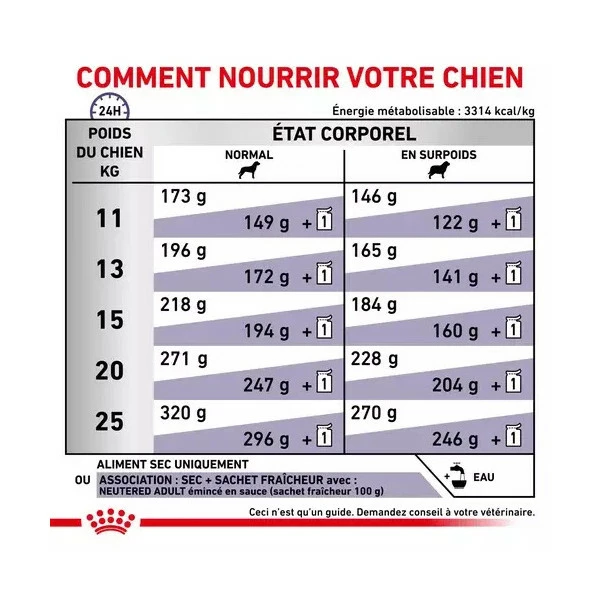 Pour chiens de race moyenne stérilisés (poids adulte de 11 à 25 kg) avec une tendance à l’embonpoint ou à sensibilité cutanée.