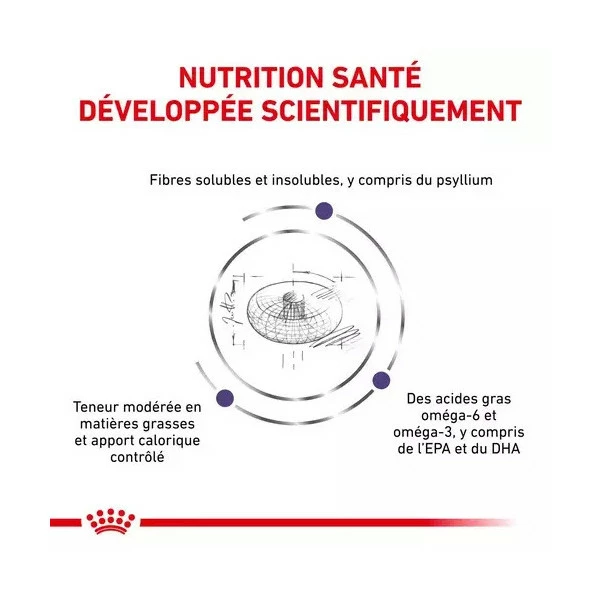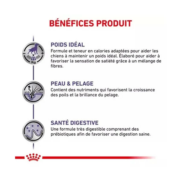 - L’association d’une formule exclusive au pouvoir satiétogène élevé et réduite en calories, d’une croquette spécifique et d’un rationnement précis favorise le maintien du poids idéal des chiens adultes ayant tendance à l’embonpoint.