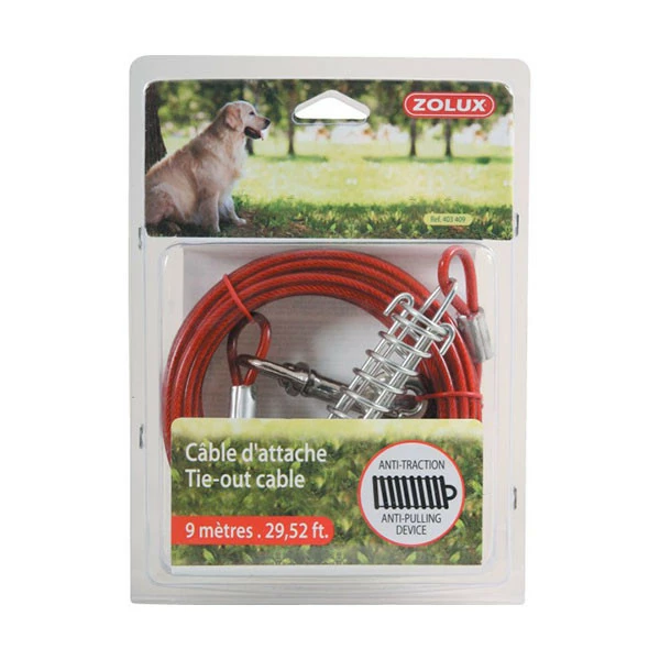 Système d’attache de sécurité avec ressort permettant aux chiens actifs de se mouvoir en extérieur sous la surveillance de leur maître et sans risque de fugue.